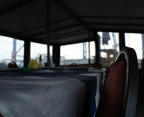 Verder bevind in en op het schip zich een ruime vergadertafel, dakterras en een heus podium waar mogelijk is muziek en of zangers te laten spelen.